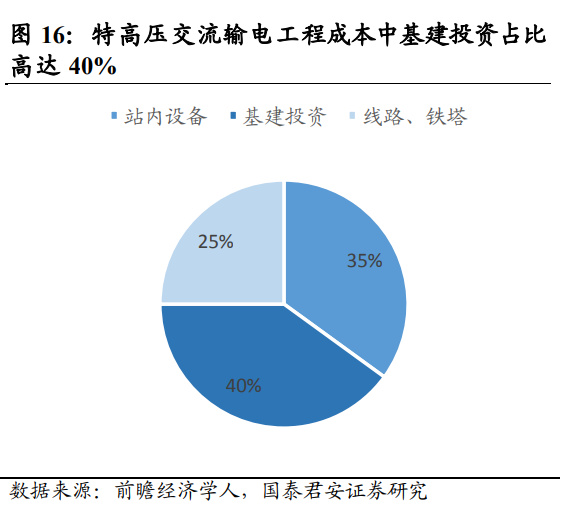 特高压输电工程成本主要可以分为站内设备、基建投资、线路和铁塔 三个部分,其中基建投资成本约占 40%、站内设备成本约占 32%~35%、 线路铁塔成本约占 25%~28%。根据《中国能源报》数据,国网在 2021 年至 2025 年投资 3800 亿元建设特高压输电工程,预计将带来 1520 亿 元的基建市场和 1216 亿元至 1330 亿元的线路、铁塔建设施工市场。