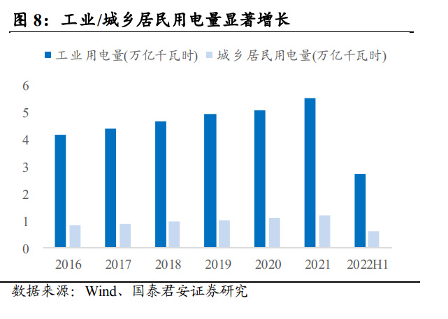 保供电是稳经济的关键,特高压电网规划及电力调度成为能源改革抓 手。2017 年至 2021 年全年社会用电量持续上升。7 月 14日,全国日用 电量创新高,达 271.87 亿千瓦时,比去年夏季最高值增长超过了 10%。 据能源局数据,2022 年 1-7 月全社会用电量累计 49303亿千瓦时,同比 增长 3.4%;7 月当月,全社会用电量 8324 亿千瓦时,同比增长 6.3%。 此外,8 月 14 日中央气象台发布多地高温红色预警,今夏,山东、河 南、江西、广东、江苏等 11 个省级电网负荷创新高。在全球变暖局势 及新基建绿电建设的政策号召下,国内工业及居民用电需求高企,自 2017 年至今特高压线路累计长度稳步上涨。