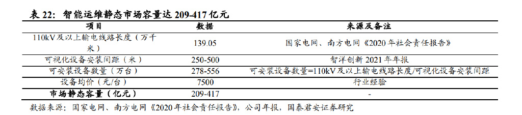 110kV及以上输电线路当前整体覆盖线路较少,智能运维静态市场容量 达 209-417亿元。过去十年,中国电力投资总体呈增长态势。根据国网及南网 2020 年的社会责任报告数据,2020 年末国网 110kV 及 以上输电线路为 114.2 万千米,南网为 24.85 万千米,合计 139.05 万千 米,比 2018 年的 126.01 万千米增长 13.04 万千米。按照行业经验,每 台智能运维设备为 5000 到 1 万元,本测算中按照 7500 元。以 110kV输 电线路杆塔间距约为 250 米为基础,假定安装间距为 250~500 米,全 国预计可安装输电可视化装置 278~556 万台(基于逐级安装),输电线 路整体的智能运维静态市场容量约为 209-417 亿元,目前输电环节智能 运维具有良好的市场空间。