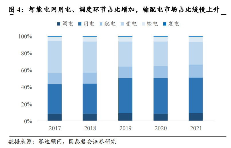 用电、调度环节占比增加,输配电市场占比缓慢上升。根据赛迪顾问, 随着电网智能化进程不断向电力需求侧推进,用电环节和调度环节将 成为智能电网未来发展的重点,市场占比持续增加。2021 年,用电环 节和调度环节在智能电网中占比达到 51.5%。相比之下,电力供给侧在 智能化先期建设初步完成的背景下,市场空间被逐渐压缩,发展速度 趋缓。变电环节市场占比呈现逐年下降趋势,输电、配电环节受分布 式能源部署向下游电力需求侧靠近的影响,市场占比保持平稳缓慢上 升趋势。