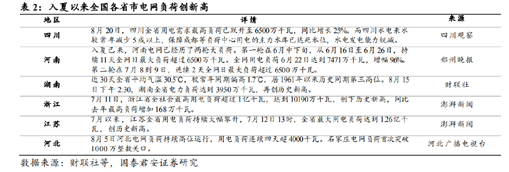 今年入夏以来全国各省市电网负荷持续创新高,电力供应形势严峻, 催化电网投资。8月17日,中国气象局国家气候中心发布数据显示当前 我国高温热浪事件的综合强度,已达 1961 年有完整气象记录以来最强。 全国气象观测站监测到 35℃以上的站点已经达到了 1680 个,37℃以上 的站点是 1426 个,仅次于 2017 年。高温 40℃以上的覆盖范围历史最 大,达 136.5 万平方公里,远超 2013 年的 77.6 万平方公里和 2017年的 99.3 万平方公里。由于高温,四川、河北、山东、浙江等省市电网用电 负荷均创历史新高,电力供应紧张。四川、重庆实施限电,通过暂停 工业用电企业生产或错峰用电来应对高温挑战。 下半年全社会用电量持续增长,全国电力供需总体紧平衡、部分有缺 口。中国电力企业联合会发布《2022 年上半年全国电力供需形势分析 预测报告》预计,下半年全社会用电量将同比增长 7.0%左右。下半年 迎峰度夏、度冬期间,全国电力供需总体紧平衡、局部有缺口、供应 有保障。预计全国最高用电负荷将超过 12.5 亿千瓦,在持续大范围高 温的情况下,可能达到 13 亿千瓦左右,同比增加约 1 亿千瓦。华东、 华中、南方等区域部分省份在用电高峰时段电力供需偏紧。在电煤供 应有保障的情况下,不会重现去年 9月份、10月份全国大面积电力供应 紧张的情况。电规总院《中国电力发展报告 2022》指出,未来三年, 电力需求仍保持刚性增长,电力供需总体趋紧,加之不稳定电源装机 比重持续增加、支撑性电源建设面临诸多约束、电网形态日趋复杂, 保障电力供应安全成为首要任务。