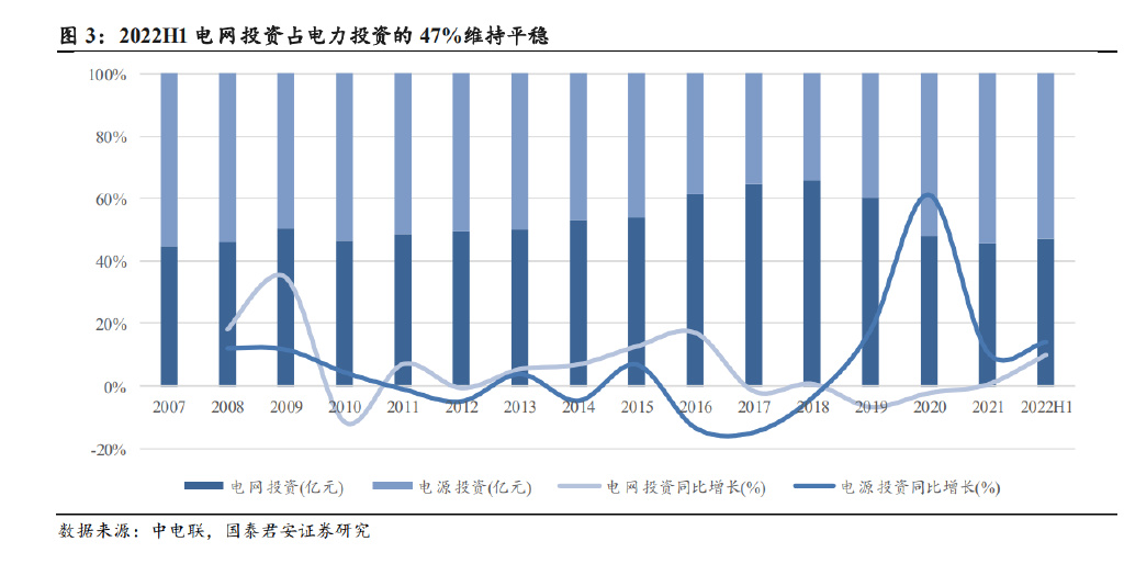电网投资占比 2018年达到高峰,近年逐渐下降但保持在45%以上。“八 五”、“九五”和“十五”期间,我国电网投资占电力投资的比重分别 为 14%、37%和 30%,远低于发达国家电网投资占比50%以上的平均水 平。2010 年至 2018年,电网投资占比逐步上升,从 2010 年的46%上升 到 2018 年的 66%。2019 年后呈下降趋势,但电网投资比重保持在 45% 以上。2022H1 电网投资 1905 亿元,占电力投资的 47%。